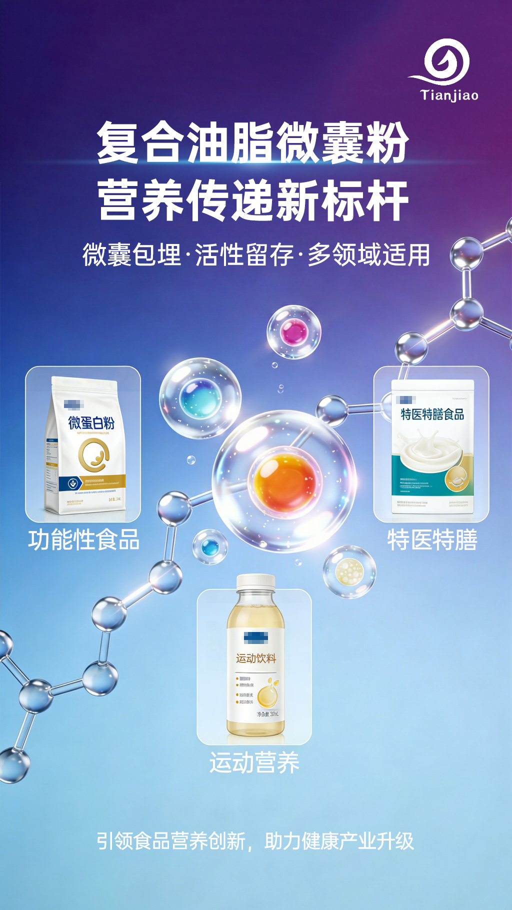 Compound Oil Microencapsulated Powder is a high-stability functional powdered oil raw material made from a scientific ratio of multiple functional oils (such as DAG oil, MCT oil, ω-3 oil, vegetable oil) through microencapsulation + spray-drying technology. Its characteristics are: integrating the advantages of multiple functional oils, and having multiple functions such as fat control, energy supply, cardiovascular support, and antioxidation. Essential Positioning: "Multifunctional oil powder solution with customizable compound functional properties according to formula goals."